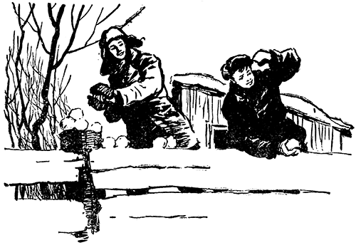На пальто у меня действительно не хватало пуговицы. Должно быть, потерял в универмаге, когда пробирался в толпе. Я с огорчением покрутил торчавшие в петле ниточки. И вдруг что-то белое промелькнуло в воздухе. От сильного удара по уху у меня перед глазами запрыгали разноцветные шарики, как будто в лицо мне швырнули горсть пороху. В тот же миг у Женьки с головы слетела шапка. Схватившись за ухо, я испуганно оглянулся, и тотчас же крепкий снежок залепил мне правый глаз. Я взвыл от боли. Но другой глаз у меня был все-таки цел, и я увидал над соседним забором двух мальчишек, взобравшихся, должно быть, на высокий сугроб. Это были Васька Русаков и верный его дружок Колька Поскакалов. Перед ними, на доске забора, рядом лежала батарея снежков.