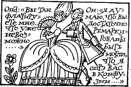 Русская речь все время перебивается у них иноземными словами, странными гибридами французских корней, немецких суффиксов и русских окончаний: «флатировать» – льстить, «адорировать» – обожать, «пансэ» – мысль, и т. п. Это было как раз в то время, когда русское дворянство «баловалось» французским языком, предпочитая любое родное слово заменить чужестранным.