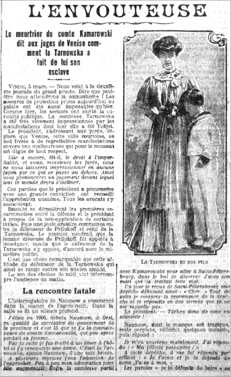 Не было сколько-нибудь известной в мире газеты, которая не аккредитовала бы на процессе своего корреспондента. Репортажи из Венеции всю весну увеличивали тираж и «Нью-Йорк таймс», и «Матэн», и «Русского слова». Ощущение сенсации привлекало в зал суда мировых знаменитостей: художника Эдгара Дега, великую французскую актрису Режан, знаменитую покровительницу искусств, подругу Сергея Дягилева Мизию Серт с мужем-художником, итальянских графинь Мончино, Папандолли, Альбрицци, Фоскари, баронесс Герхардт и Вандерговерн. Всеобщее внимание вызвали граф Николай О’Рурк, отец Тарновской, и бывший пермский губернатор Александр Наумов, отец убийцы Комаровского.