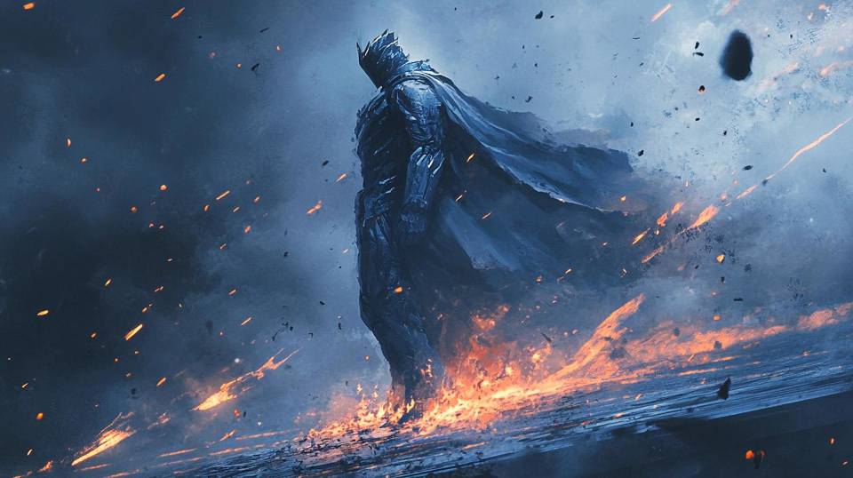 Огромный, более двадцати локтей ростом исполин, рядом с которым я выглядел ничтожно, воин в отливающих синим металлом доспехах, в которых отражались вспышки молний. Каждая деталь брони была произведением искусства, явно не технологический доспех, а смесь редчайших рун и древних ритуалов, превративших его в уникальный артефакт невероятной силы.