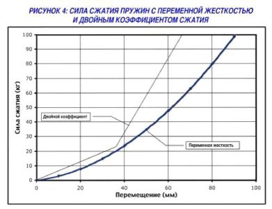 В простейшем случае жесткость пружины не меняется при сжатии, поэтому график представляет собой прямую линию, такие пружины применяются в кольцевых мотогонках. Двойные или прогрессивные пружины меняют свою жесткость при изменении сжатия.