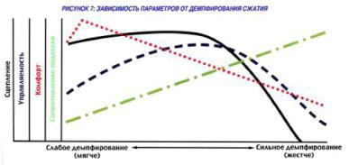 Конструкторы подвесок и тюнингеры добиваются, чтобы пики графиков были как можно ближе друг к другу. Им приходится применять изощренные формы каналов и по разному демпфировать подвески при разных скоростях их работы, чтобы упростить настройку. При поиске компромисса приходится учитывать огромное множество факторов, поэтому единственно правильный способ настройки – изменять за один раз один параметр на одну ступень.