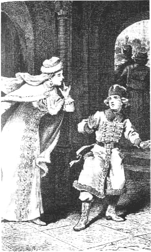 Разом спало оживление Вани, когда он, сопровождая царя, вышел из терема царицы. Он так надеялся, бедный мальчик, что в награду за его пляску царь тут же даст ему милостивое разрешение хоть одним глазком повидать нынче князя. Но ничего этого, однако, не случилось. Царь хвалил Ваню, гладил по головке и подарил несколько золотых грошей, но о князе Дмитрии не обмолвился ни полусловом. Сам же Ванюша, боясь навредить как-нибудь милому князю, не решался так скоро заикнуться о нем перед царем.