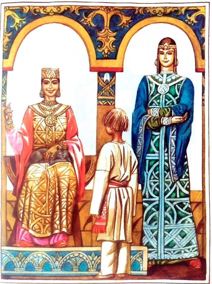 Сама молодая княгиня тоже показалась мальчику дивом дивным. На голове золотая шапочка – «соро́ка». Рукава у платья шёлковые, подол парчовый. Разве можно сравнить такую одежду с льняной рубахой, какую носила его мать?! Но, увидав вышивку на Красавином полотенце (Званка обёртывал его вместо пояса, чтобы никогда не расставаться с прощальным подарком), княгиня стала её разглядывать со вниманием.