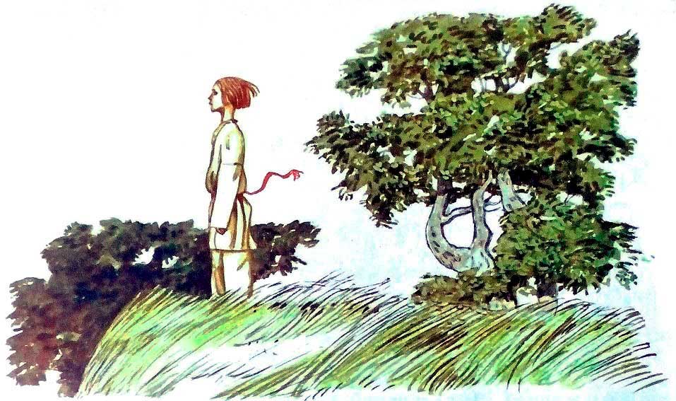 …Час прокатился. И другой ему вослед. Солнце высоко уже на небе. А Званка всё не уходит с холма. Всматривается в синеватые, дрожащие от зноя дали. За последней дубравой с её живой прохладной тенью, за ближней зелёной равниной расстилается неведомая ему степь. Там, на земле, сухой до звона, растут только горькие колючие травы.