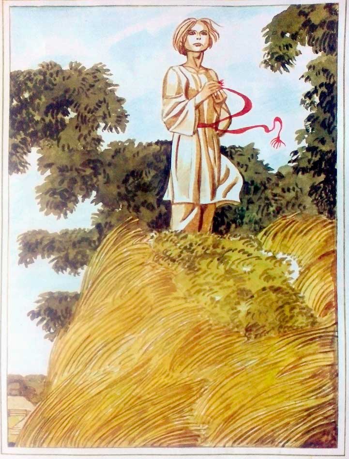 Мать Званки рассказывала про то же самое по-иному. Была она рукодельницей, выдумщицей. Умела красить льны ягодами крушины в зелен цвет, а листьями ревеня в небесный. Ткачество её и вышивание узнавали в самом Киеве. Говорили: ведёт Красава-мастерица узор, как реченьку, струйку за струйкой, ровно и прихотливо.