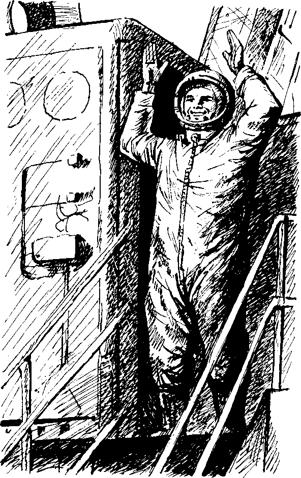 Стоя между небом и Землёй, прежде чем войти в ракету, запеленаться в ремни, он только улыбнулся и поднял обе руки кверху.