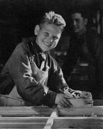 В последнем снимке автору удалось создать обаятельный образ веселого, вихрастого, улыбчатого паренька, будущего мастера, строителя. Поза, поворот, направление взгляда здесь выбраны так, что и в станковом портрете сохраняется динамика действия, и это делает портретную композицию особенно жизненной.