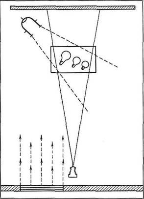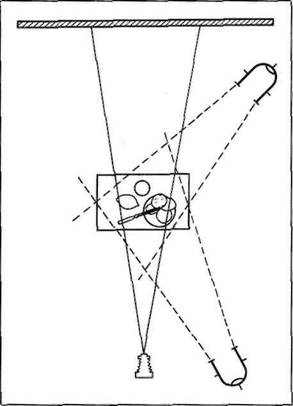 Так, изобразительное решение натюрморта на фото 135 основано на диагональной композиции, на передаче различных фактур снимаемых предметов: прозрачного, матового и молочного стекла колб электрических лампочек. Эти фактуры, как показывает схема света на рис. 19, отработаны с помощью одного источника света, который освещает натюрморт с задне-бокового направления. В качестве заполняющего света здесь использован рассеянный дневной свет, падающий в помещение из окна, возле которого установлен натюрморт.