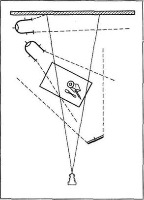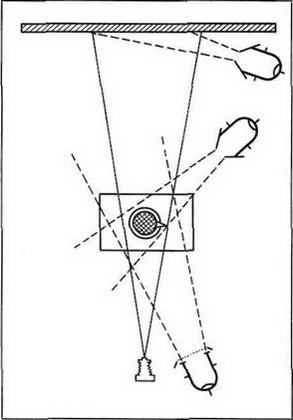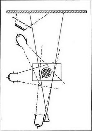 Световая отработка фона осуществляется с помощью третьего осветительного прибора. Световые пятна и блики, которые могут возникнуть при этом на фоне, должны быть продолжением световой разработки принятого за основу эффекта освещения и увязаны с действием прибора рисующего света. Эти обстоятельства диктуют место установки фонового прибора: на нашей схеме он должен быть установлен, как и прибор рисующего света, – слева от модели.