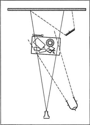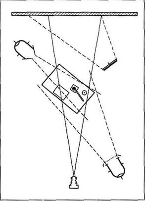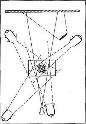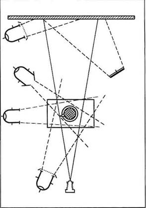 Одна из возможных схем расположения осветительных приборов приведена на рис. 14. Она показывает, как увязывается между собой действие трех источников света, направленных на модель, – рисующий, заполняющий и контурный света как бы образуют одну группу и направлены на модель из одного сектора, расположенного слева от модели и фотоаппарата, что и создает иллюзию единого светового потока, освещающего модель (см. фото 51).