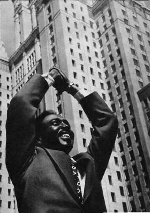 Но в этом снимке ракурс оказывается действенным приемом не только из-за характерного перспективного рисунка фона. Смысл и цель применения ракурсной съемки здесь заключается в другом. Нижняя точка съемки обусловливает особое соотношение фигуры переднего плана и фоновых элементов: фигура человека проецируется на фон верхней части высотного здания. От этого она кажется словно приподнятой, и "приподнятость" сообщается не только линейному рисунку изображения, но и всей изобразительной трактовке темы, чего, собственно, и добивается автор. Тема при этом получает особо полнозвучное выражение.