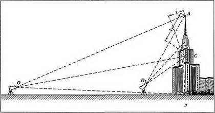 Как показывает рис. 6, при съемке длиннофокусным объективом с малым углом зрения расстояния до нижней и верхней частей изображаемого объекта отличаются друг от друга незначительно (отрезок l).