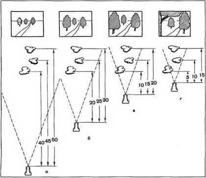 Поясним сказанное примером. На рис. 3 схематически изображен объект съемки, отдельные элементы которого находятся на расстоянии 5 м друг от друга. В первом случае (фигура а) съемка ведется с расстояния 40 м до переднего плана. Расстояния до других элементов объекта составят 45 и 50 м и будут, следовательно, отличаться друг от друга незначительно. Вследствие этого и все три дерева, имеющие в действительности одинаковую высоту, будут изображены на снимке почти в одном масштабе, будут иметь примерно одну величину.