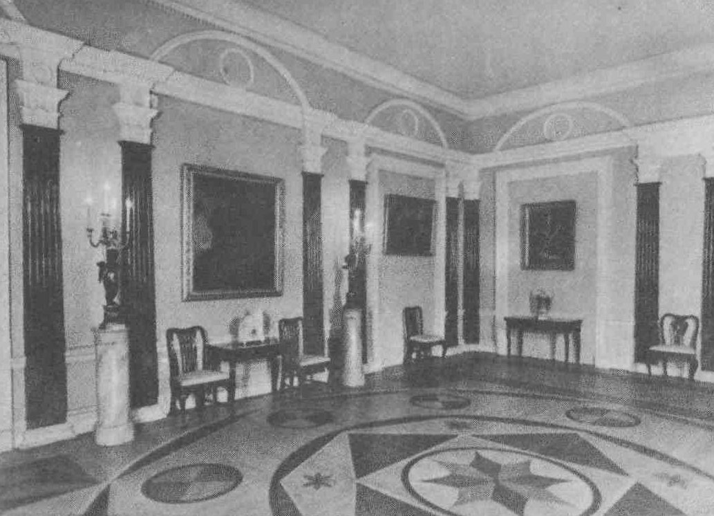 Большой зал и кабинеты павильона украшены живописью, барельефами, чеканной бронзой. Тонкие рисунки наборных паркетных полов созданы из различных пород дерева.