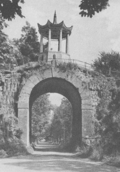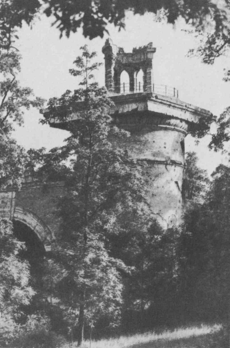 От башни перекинута мощная каменная арка, продолжением которой служит искусственная земляная насыпь, засаженная деревьями.