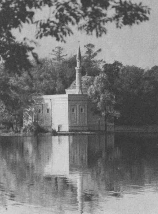 На мысе, вдающемся в Большой пруд, стоит небольшой изящный павильон с двумя куполами и башенкой в виде минарета – Турецкая баня.