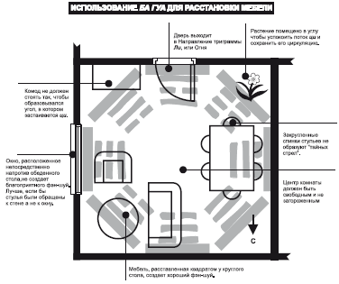 Потоки ци в комнате должны вытекать легко и без препятствий, и лучше, если через вторую дверь. Мебель можно расположить круговыми, восьмиугольными или квадратными группами посередине помещения. Постарайтесь разместить большую часть мебели параллельно стенам. Если в стульях имеются зазоры или отверстия, нельзя чтобы их направление совпадало с направлением окон или дверей, то есть они не должны быть обращены к ним. Так же нежелательно, чтобы спинки кресел, стульев или дивана были обращены к входной двери гостиной.