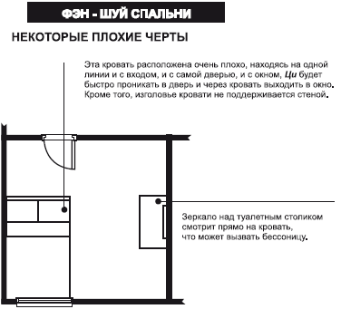Также нежелательно видеть из окна открытый пустырь, высокие деревья, здания или холмы. Лучше если перед спальней будет расположен балкон, либо задрапировать окна шторами. Спальня не должна располагаться прямо около входной двери в квартиру, иначе обитатели будут часто болеть и уставать, либо спать в больших количествах. Нейтрализовать этот негативный фактор можно, если на дверь спальни повесить зеркало, либо «музыку ветра» над дверью.