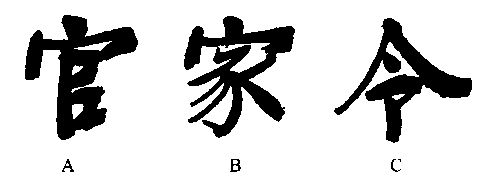 Верхняя часть иероглифов «А» и «В» представляет собой компонент китайского иероглифа со значением «крыша». Обратите внимание на прогиб в середине иероглифа, который создает эффект кривизны китайской крыши. Верхняя часть иероглифа «С» означает «человек», но имеет сходство с верхней линией крыши. Обратите также внимание на изгиб и поднимающуюся вверх дугу в нижней его части.