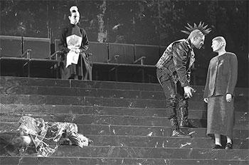 Павильон, стены дома Железновых – долой! Хотя дом – крепость, бывшая, разрушающаяся крепость вместе с семьёй, с его обитателями, этот образ стоило бы поискать. Вместо того на всю сцену – обшарпанная лестница и обрамляющие её ряды театральных кресел (в скольких спектаклях я подобное видела!). Поди попробуй в таком интерьере, мотаясь по лестнице вверх-вниз, сыграть трагедию семьи! Впрочем, этой задачи и не ставится. Режиссёр с исполнителями сразу же осудил домочадцев – и «тифозной» стрижкой Вассы (актриса Е. Дурова), и робами с навешанными на них советскими орденами, подчеркнул их физические недостатки, просто дебильность. Особенно «хорош» Прохор Железнов – рокер в коже, в металле, с истерическими перепадами настроения, видимо, наркоман – его разрушительное влияние в Людмилке, похожей на тряпичную, сломанную навсегда куклу. Сюжет отметён сразу, действующие лица ясны и одинаковы с начала и до конца, ведь и не скажешь – герои… люди… характеры… Вышли, покривлялись – и всё. Не хочется обижать актёров, но ведь так и было: не захотели, не попробовали разобраться в судьбах горьковских героев. Они им неинтересны: обезобразить, заклеймить – и хватит. Зачем же именно «Вассу» брали к постановке? Гроб с главой семьи, мужем Вассы, вынесли в начале в сопровождении батюшки и декоративных «ряженых». Чего же после выноса трупа заниматься сюжетом?