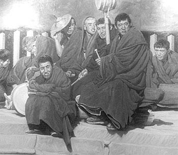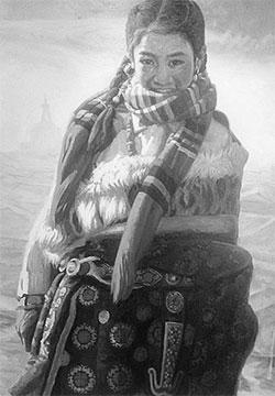 Но выставка в Рафаэлевском и Тициановском залах музея Академии художеств необычна тем, что она представила нам китайское реалистическое искусство… китайского же происхождения. На втором этаже величественного здания на Университетской набережной – выставка мастера масляной живописи (техники, неизвестной в Древнем Китае) Хань Юйчэня. Это картины из жизни современного Тибета, который любит за его фантастическую природу и выразительные сцены быта китайский мастер. Настоящая крупноформатная тематическая картина, жанр, который далеко не всегда привлекает художников из-за его сложности, повествовательности, необходимости иметь навык «рассказать историю» в лицах и типажах. Мы видим лица простых жителей Тибета, мужчин и женщин, занятых повседневным трудом: они пасут скот на фоне заснеженных горных вершин, варят еду, бредут под ветром в паломничество к святым местам. Много улыбающихся лиц, хотя понятно, что люди, которых художник застиг с фотоаппаратом или с блокнотом для зарисовок, оторвались от своих каждодневных трудов и не привыкли позировать. Китайский живописец с особой любовью пишет детей, их нежные лица на фоне суровых гор или резных дверей домов. Буран и ветер, закутанные лица сменяются сияющим горным солнцем. Видно, что игра светотени, блики солнца также привлекают Хань Юйчэня, как мастеров раннего Ренессанса – перспектива. Ведь китайский художник – по сути, самоучка. Выставка сопровождалась старательно переведённым фильмом, где очень деликатно сказано о трудном детстве художника, но в большой отечественной аннотации к выставке говорится более прямо: Хань Юйчэнь – из репрессированной в годы «культурной революции» семьи, у него не было возможности учиться профессионально, он страстно любил рисовать и лишь позже стал брать уроки у профессионального художника. Чтобы прокормить себя, он тяжело и много работал (в 16 лет – грузчиком на металлургическом заводе). Но мир, который мастер создаёт в своих произведениях, кажется почти безмятежным – несмотря на почти осязаемую суровость климата и быта. Хань Юэйчэнь, будучи представителем основного в Китае народа хань, с большим интересом и тщанием выписывает детали яркой, декоративной тибетской одежды, непохожие типы лиц.