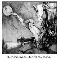 Одна из последних его работ была выставлена в залах Осенней выставки Союза художников на Большой Морской, 38. И сюжет, и название её столь необычны, что кажутся почти шокирующими. Она называется «Мечта самовара». Так скорбно, с примесью чёрного, «макабрического» юмора называли инвалидов времён Великой Отечественной, лишившихся ног, а иногда – и ног, и рук. (Читатель и зритель со стажем вспомнит здесь знаменитый рассказ Юрия Нагибина «Терпение» и его экранизацию.) Мы видим на картине человека без ног, который «пеньком торчит» на своей тележке (точно по слову писателя – хоть и неизвестно, читал ли художник этот горький рассказ). Тело его всей силой стремительного движения, диагональным наклоном устремлено вверх, к далёкой, недосягаемой луне. Туда жадно тянется его рука, пока другая тщится найти опору на грешной и многострадальной земле. Главная линия преемственности, конечно, роднит картину Николая Лысака с метафорической живописью конца ХХ – начала ХХI века. В ней, как и в литературе советского периода, война становилась поводом для размышления о вечном противостоянии молодости – и разрушения, красоты – и смерти. И – в лучших традициях отечественной культуры – Николай Лысак не подавляет человека образами смерти и разрушения. Он оставляет свет в конце тоннеля, он даёт надежду.