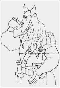 «Просторная гридница, где происходят пиры конунга Хальвдана Чёрного, освещена множеством жировых светильников, они укреплены на железных костылях, вбитых в брёвна стен. Посреди земляного пола пылает очаг, перед ним расположено почётное сиденье конунга, украшенное с двух сторон резными столбами… Конунгу, как и прочим участникам пира, не терпится послушать, что расскажут люди, прибывшие из далёких краёв… Мало-помалу гости начинают рассказывать о далёкой стране Градарики, о её городах, о Ладоге…»