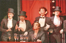 Зато с мсье Пьером (Пётр Красилов) всё ясно. Пусть не с первой, так с пятой минуты. Не возьму на себя смелость утверждать, что это так уж плохо. Потому как традиция осимпатичивания зла, набирающая обороты и на театре, и в литературе, о телевидении и говорить нечего, не просто пагубна, а пагубна коварно. Она сродни опасной болезни, которую пребывающий в благодушестве больной не торопится лечить, ибо не чувствует до поры до времени никаких неудобств. А там глядь – и финиш! Неизлечимо! Этот щеголеватый, не просто приятный, а приятный прямо-таки во всех отношениях господинчик, конечно, не сам дьявол, но уж один из его ближайших подручных – точно. И то, что он делает, – мерзко и гнусно: по законам города палач сначала должен подружиться с осуждённым и только потом смахнуть ему голову с плеч. Так что спаситель, роющий избавительный туннель, всего лишь укорачивает спасаемому путь на эшафот. Где-то Красилов перебарщивает с «перетекаемостью» своего героя, где-то невольно, вероятно, по старой привычке, использует приёмы из амплуа лирического героя, чем до некоторой степени и вызвана симпатия публики, которой сломать привычный шаблон гораздо труднее, чем актёру. Однако даже при некоторой необжитости роли Красилов смог перешагнуть черту узнаваемости и начать доказывать, что ему доступны гораздо более сильные драматические краски.