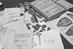 – Да, недавно мне позвонил один человек с предложением встретиться, сказав, что может дать информацию в связи с расследованием гибели польских офицеров в Катыни. Встретились в тот же день. Он представился, назвал свою фамилию, которую в целях его безопасности раскрывать пока не буду. Просто боюсь, что с ним могут расправиться. Буду говорить языком фактов, в том числе приведённых им. Он сообщил, что имел прямое отношение к подделке архивных документов, включавших материалы и по расстрелу пленных поляков. Рассказ свой подтверждал документами, вещественными доказательствами – бланки 40-х годов прошлого века, поддельные оттиски штампов, подписей. Вот, пожалуйста… (В.И. достаёт из сейфа и раскладывает на столе целую россыпь печатей, подделок факсимильных подписей, бланков и т.п.)