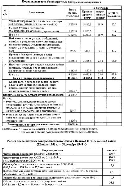 В современной исторической науке существует ряд устойчивых мифов, связанных с Великой Отечественной войной. Один из них повествует о том, что советское военное руководство якобы не жалело жизней своих солдат и добилось победы только за счёт неисчислимых потерь. Спор об этом ведётся давно. В 1946 году Сталин объявил, что общие потери (гражданские и военные) составили 7 миллионов человек. После этого цифра постоянно возрастала. Во времена Хрущёва она достигла 20 миллионов, а в годы перестройки – 27 миллионов. Это почти в три раза больше, чем мы потеряли за восьмилетний период Первой мировой и Гражданской войн. За годы войны были разгромлены и уничтожены 297 дивизий и 85 бригад (55% из них в 1941 году) в 52 основных оборонительных и наступательных сражениях, а также в 73 самостоятельных фронтовых операциях. Авторская группа этого издания на основе ранее закрытых для печати архивных документов уточняет число погибших – 26,6 млн. человек. Из них 8 млн. 668 тыс. 400 военнослужащих списочного состава.
