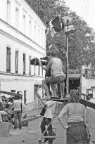 В минувшие субботу и воскресенье проходили съёмки двух эпизодов будущей четырёхсерийной ленты. Речь о 1921 годе, когда Ленин направил Горькому письмо с рекомендацией поехать за границу на лечение, а одновременно была арестована помощница писателя Мура Закревская. Эпизод встречи писателя с Мурой (которая была внезапно выпущена из ВЧК) и снимался в первый день. А во второй – прощание с Марией Андреевой. При проведении съёмок, как указывается в кратком синопсисе, были задействованы 3 актёра, 2 ретро-автомобиля. Один из актёров – Георгий Тараторкин, которого вы и так узнаете на снимке. Об остальном, что касается этого фильма, в одном из ближайших выпусков рубрики «Наше московское кино». А в этом номере её очередной выпуск (стр.9).