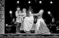 У Гриншпуна Островский получился очень лёгкий, ироничный. Никакой архаической «заплесневелости», хотя и бороды веником в наличии, и косматые тулупы. Но наряду с ними – бешеный темперамент, заданный постановщиком и с удовольствием «одушевляемый» на сцене полностью молодёжной актёрской командой. Действие несётся как песня, спетая на одном дыхании, – не успеешь оглянуться, а она уж «кончилась вся»… Комедию играют яркими, сочными красками, сохраняя оригинальный текст, но вывернув наизнанку смысл. Отчего так в клочья рвутся страсти, отчего так мечутся господа, проезжающие в поисках радостей, перца и соли жизни? Да оттого, что уж больно скучно всё и вторично. Очередное пылкое чувство не греет – всё это было, и почему бы не стравить меж собой двух достойных дам и не пощекотать нервы старому грозному мужу, который явно в своём доме не хозяин?..