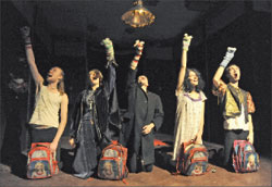 Молодые актёры, набранные по кастингу, небесталанные, кстати, откровенно играют «в королей и королев», как раньше дети играли в «казаки-разбойники». Одни с большей достоверностью, как, скажем Дина Штурманова (Офелия) или Олег Лобозин (Гамлет), другие – с меньшей. Все эти приступы экзистенциального отчаяния, тоска по власти, жажда свободы, мечты о любви – всё ведь не всерьёз, «покабутки». Вот мы сейчас доиграем, спрячем в ранцы разноцветные носки и пойдём заниматься своими делами. А вы тут сидите и думайте, для чего мы весь этот тарарам устроили.