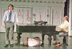 С лирической линией получилось, к сожалению, не так убедительно: ни Эмилия в исполнении Анастасии Лебедевой, ни тем более оспаривающие её друг у друга братья Мооры не похожи на людей, искренне любящих. Но не исключено, что и тут был заложен подтекст, который просто не до конца удалось раскрыть актёрам: современному человеку не до любви – чистого секса, имитации, игры в любовь ему вполне достаточно. Однако по части психологической обоснованности у спектакля есть тонкие места. Почему старшему Моору безразличны (не на словах, а на деле) собственные сыновья, наследники былой его славы? Чем спровоцирован стихийный бунт карловых сподвижников: ладно, от того отец отвернулся, а им-то кто на хвост наступил? И с музыкой режиссёр, пожалуй, слегка переборщил (вполне хватило бы одного Das Wandern, блестяще отыгранного и актёрами, и пианистом Игорем Горским), тем более что Шуберт драматическим артистам оказался не по зубам.