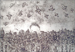 Совсем другого эффекта достигает Юрий Купер в шести офортах к сборнику стихотворений Б. Пастернака «Сестра моя – жизнь», изданному в 1990 году на бумаге ручной отливки. Купер – воспитанник Веры Тарасовой, ученицы легендарного педагога Санкт-Петербургской академии художеств Павла Чистякова, открывшего талант Врубеля. В экспонируемых работах прослеживается эта тонкая ниточка – художественная связь поколений, выходцев одной школы. Пикториальный стиль, мельчайшая прорисовка деталей, приближающаяся к фотореализму, скупая монохромность, ставящая акцент на образах: из падающего коробка невесомо вылетают спички, стальное перо, разбрызгавшее чернильные пятна поверх изображения самого себя, – «Февраль. Достать чернил и плакать!»…
