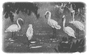 С той стороны сверкала и искрилась на солнце голубая лагуна. Вода в ней была совершенно неподвижна; камни вокруг густо поросли зеленым мхом; на отмели неподвижно застыли на тонких ногах фламинго, вытянув вверх длинные розовые шеи. Пролетели над самой водой два пеликана, широко взмахивая крыльями.