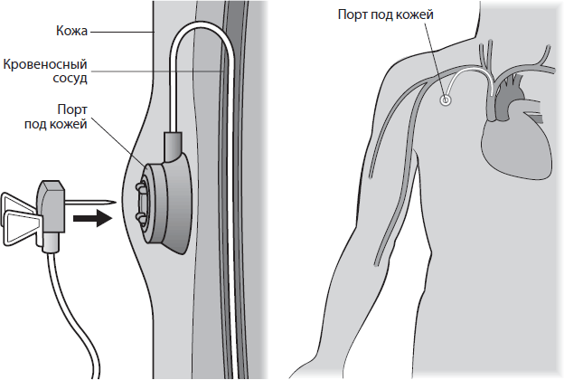 В крупную центральную вену, расположенную на грудной клетке пациента, вводят длинную канюлю. Она соединяется с портом, который устанавливается под кожу – обычно под ключицу. Химиотерапевтические препараты вводят через порт, прокалывая его при помощи игл, и опытные медсестры также могут брать оттуда кровь. Как правило, порт устанавливают под местной анестезией и оставляют до тех пор, пока вы не закончите лечение.