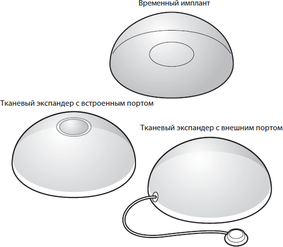 Временный грудной имплант иначе называется «тканевым экспандером». Это пустой силиконовый каркас, который можно заполнить стерильным физиологическим раствором. В некоторых экспандерах, помимо жидкости, также содержится небольшое количество силикона. Экспандеры заполняются раствором через порт, который располагается в центре экспандера, либо отдельно на боковой поверхности тела, соединяясь с экспандером через небольшую пластиковую трубку.