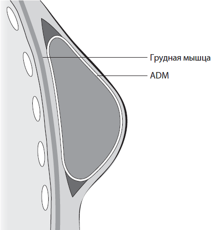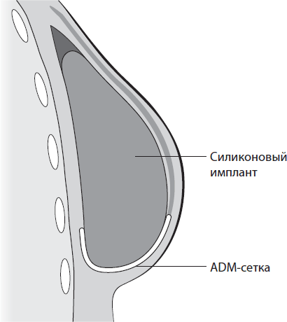 При втором способе хирург использует специальную сетку, которая называется «бесклеточной кожной матрицей» (ADM). Она частично или полностью покрывает силиконовый имплант, отчего грудь выглядит более естественно. Существует два варианта установки сетки. Доктор может поднять грудную мышцу, установить под нее верхнюю половину импланта, а затем пришить сетку снизу грудной мышцы к грудной стенке по линии бюстгальтера и перевязать нижнюю половину импланта.
