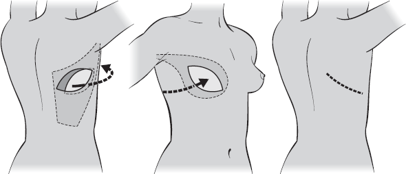 1. Лоскуты на ножках – такие лоскуты, которые остаются прикрепленными к донорской области (например, к верхней части спины и живота) и поворачиваются на сосудистой и/или мышечной ножке, содержащей сосуды, к грудной стенке, создавая форму груди.