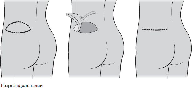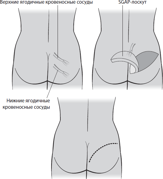 Данный свободный лоскут создается на основе кожно-жировой ткани, которую забирают с области верхней или нижней части ягодиц. Один из недостатков этого метода: область ягодицы, откуда взяли лоскут, навсегда останется плоской.