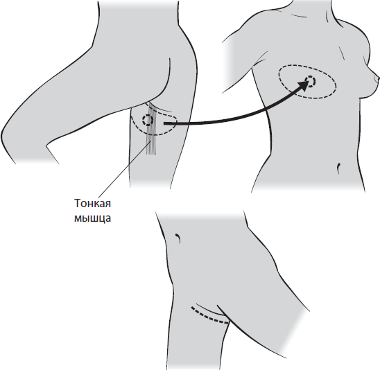 Это свободный лоскут на основе тонкой мышцы и кожно-жировой ткани внутренней части бедра. Остальные мышцы ноги собирают в одну, далее она используется при реконструкции. После проведенного вмешательства у вас останется горизонтальный рубец, расположенный по всей поверхности верхней части бедра в паховой области. Если вы худощавая, хирургу могут потребоваться лоскуты двух бедер, чтобы сформировать молочную железу необходимого объема.