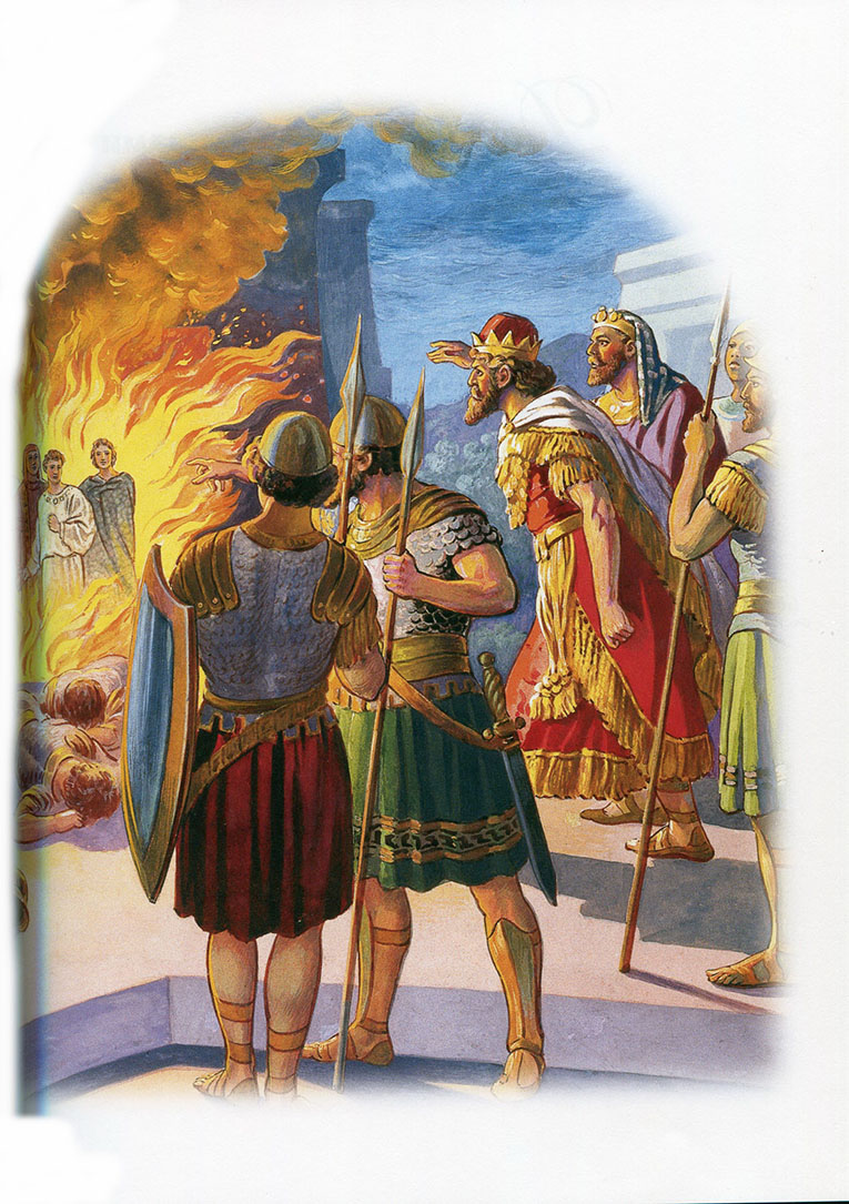 Народ царства Иудина был взят в плен в Вавилон. Три прекрасных отрока Анания, Мисаил и Азария были призваны служить при дворе Вавилонского царя Навуходоносора. Царь сделал золотого истукана высотою в тридцать метров и поставил его на поле в Дейре. И тогда вельможи провозгласили: