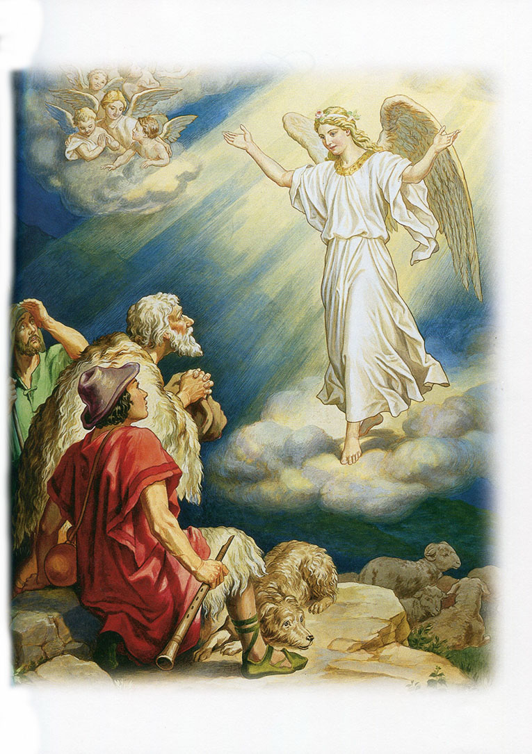 Несколько пастухов, которые жили недалеко от Вифлеема, охраняли в ту ночь стадо овец. Внезапно свет озарил их и явился Ангел Божий перед ними. И души их наполнились страхом, смешанным с благоговением. Но Ангел сказал им: