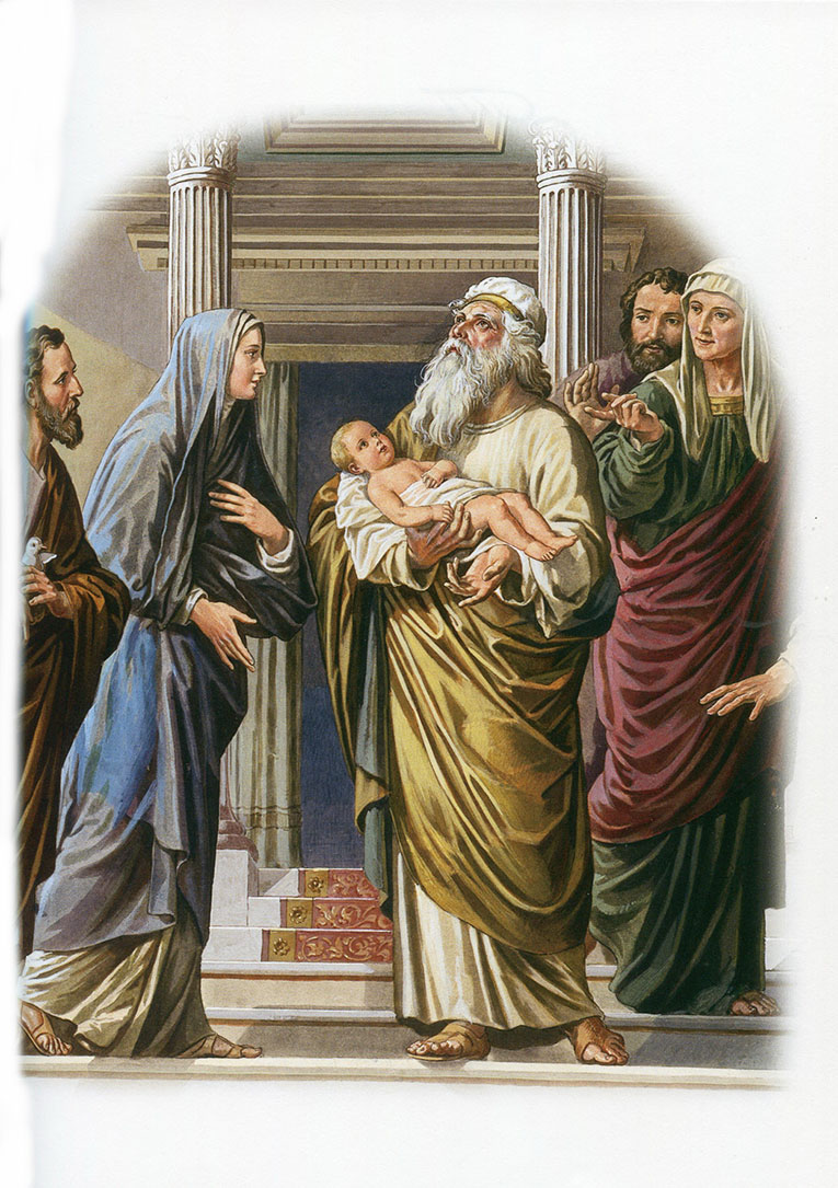 Мария и Иосиф нарекли Младенцу имя Иисус, как было предсказано Архангелом ещё до Его рождения. Через сорок дней Мария с Иосифом принесли по традиции Младенца Иисуса в храм в Иерусалиме, который находился довольно далеко от Вифлеема. Было положено посвящать всех новорожденных мальчиков Богу и принести в жертву двух горлиц.