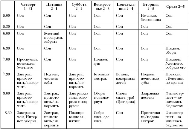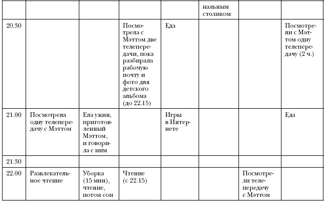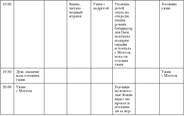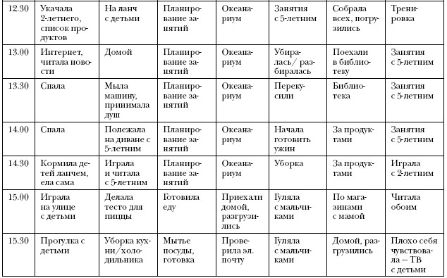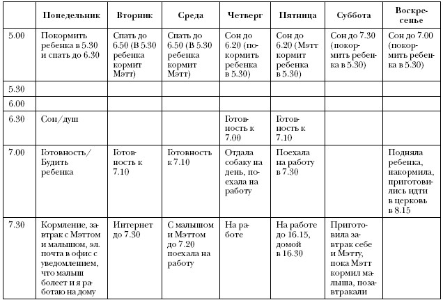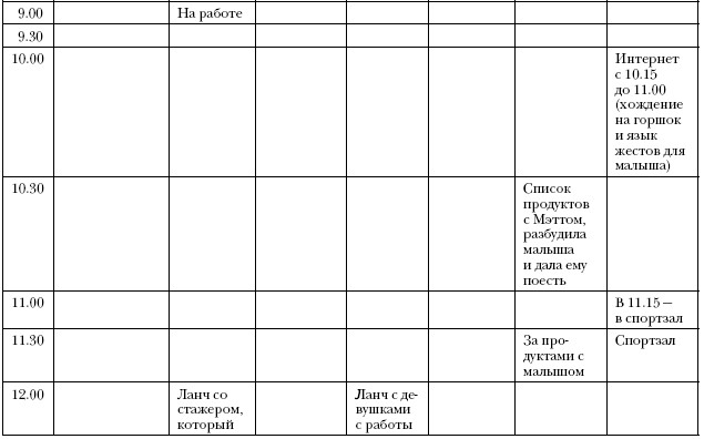В отсутствие обычного школьного расписания дни Джейми были достаточно свободны, если не считать посещений детских врачей. Я подумала, что ей пойдут на пользу две вещи. Во-первых, ей нужен был рациональный утренний режим. Она говорила мне, что хотела бы вставать до подъема детей, чтобы иметь возможность привести себя в порядок, проверить почту, просмотреть социальные медиа и поделать свои дела, в том числе домашние. Таким образом, она смогла бы меньше отвлекаться, будучи с детьми. «Когда я встаю одновременно с ними, я сразу же перехожу в возбужденное состояние, и мое поведение может быть вовсе не таким доброжелательным и спокойным, как хотелось бы», – сказала она.