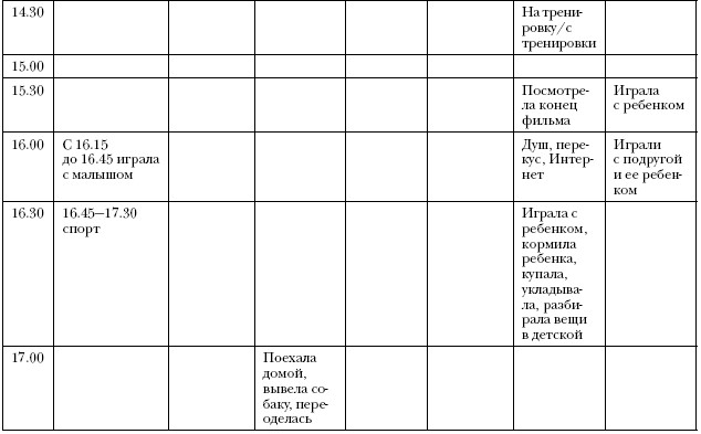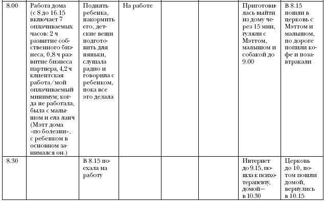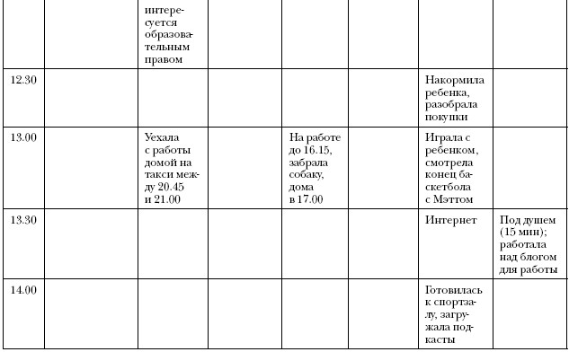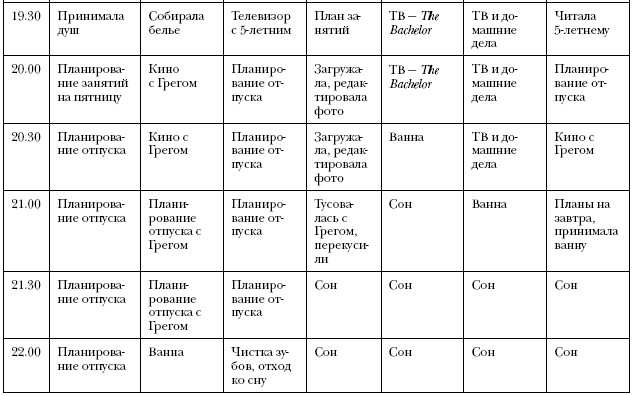 После того как вы соберете данные, посчитайте общие суммы времени по категориям. Какие выводы вы могли бы сделать, глядя на эти цифры? На что уходит слишком много времени, а на что – явно недостаточно? Что в вашем графике вам нравится больше всего? Что вы хотели бы изменить?