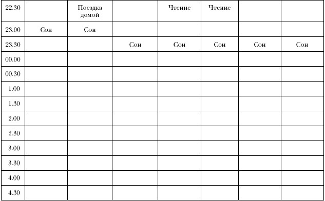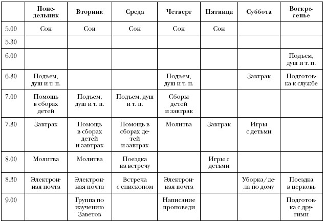 Посмотрев журнал учета времени, я заметила, что у Мура есть несколько хороших привычек. Он не упускает случая посетить спортзал («Если я как следует не взмокну в течение дня, то начинаю напрягаться»), но его дни выглядели не очень упорядоченно в связи с необходимостью реагировать на проблемы прихожан. Ему часто приходилось устраивать встречи по вечерам. Его профессия подразумевает работу по уик-эндам, поэтому он попытался использовать в качестве выходного пятницу – однако в ту пятницу, когда мы с ним беседовали, он проводил похоронную службу.