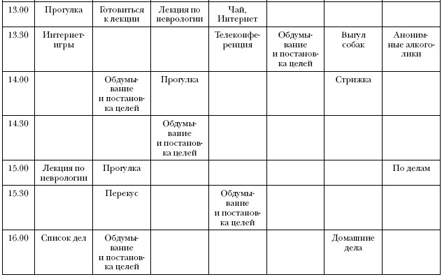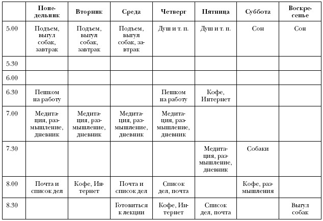 Я спросила, сколько времени он хотел бы посвящать каждой из своих рабочих задач. Даррен сказал, что желал бы заниматься подготовкой лекций 2 часа в день и час посвящать своей дипломной работе. Он утверждал, что у него не очень хорошо получается соблюдать «священное время для творчества». В идеале хотелось бы иметь два блока времени, выделенных на писательство: один для научных трудов и один для Интернета и блогов. Каждый как минимум по часу. Его день начинался благими намерениями (он точно был ранней пташкой и рано начинал работу над своими записями), но, по его словам: «Я много гуляю по Интернету. Большую часть долгих перерывов на чай или кофе я брожу по Сети или проверяю электронную почту». Он попросил совета, как с этим справиться.